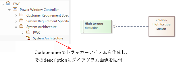 Enterprise Architectでエクスポート対象のパッケージ配下のダイアグラムも、Codebeamerへエクスポートすることができます。Codebeamerではダイアグラム用のトラッカーアイテムが作成され、そのdescriptionにダイアグラム画像が貼付されます。(マッピング設定でトラッカーアイテム以外のTypeも指定可能)