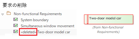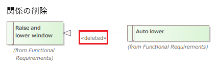 インポートにおいて、Codebeamerの要求の削除や要求間の関係の削除は、Enterprise Architectでは当該要素や接続にステレオタイプ「LemonTree Connect::deleted」を設定する形で反映され、削除はされません。また、当該要素の境界が赤色になります。