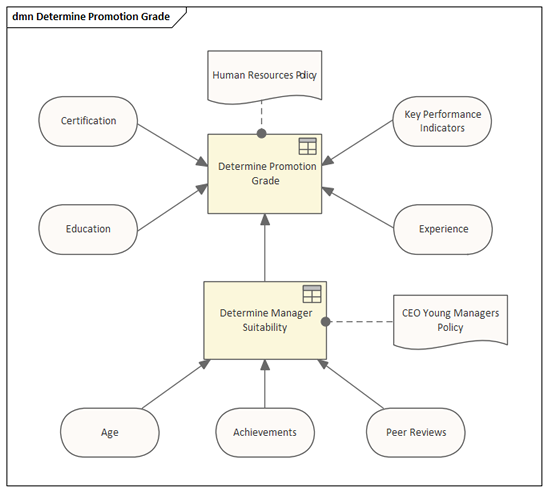 DMN意思決定要求モデルは、1つ以上の意思決定要求図(DRD)に描かれた意思決定要求グラフ(DRG)で構成されます。モデル化される要素は、意思決定、ビジネス知識の領域、ビジネス知識のソース、入力データ、および意思決定サービスです。