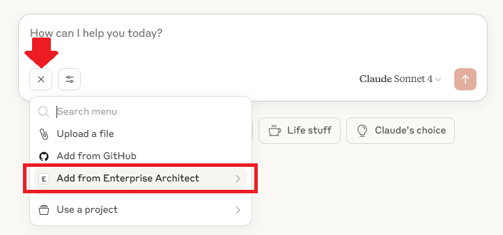 For example, when using prompts in the Claude for Windows, click the "+" icon to display the menu before starting the chat. Then select "Add from Enterprise Architect" -> "Creation Rules for SysML 1.5" or "Creation Rules for UML".