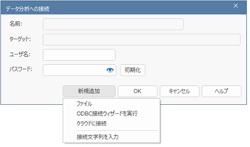 ODBC接続は、外部のデータベースなどに接続するために利用します。また、Microsoft Access や Firebirdのファイルへも、ODBCを介して参照できます。ODBCの種類(接続先のデータベースの種類)は問いません。