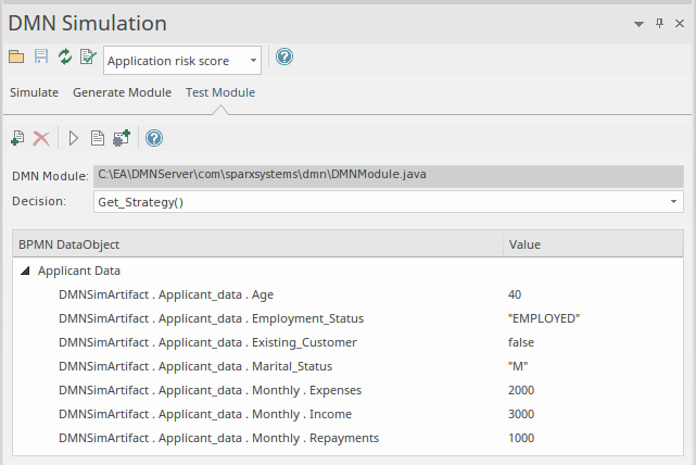 シミュレーション > デシジョン分析 > DMN > DMNシミュレーションウィンドウ Generate Moduleタブ |