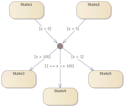 連結点擬似状態は複雑な遷移パスを表現する場合に利用されます。連結点は共通の遷移パスへと遷移をまとめる場合に利用されます。さらに、連結点は複数の遷移へと分割できます。フォーク/ジョイン擬似状態と異なる点は、連結点は入出力の遷移に対してガード条件を設定できます。つまり、ガード条件を満たさない場合には遷移しない場合があります。次の例では連結点擬似状態においてガード条件を利用した例です。