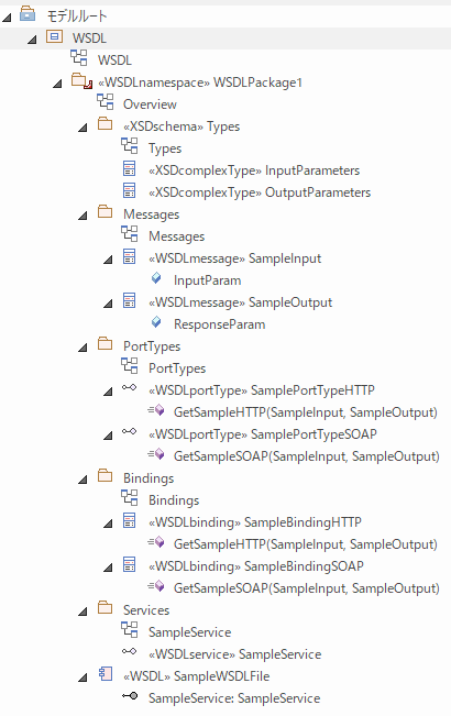 OKボタンを押します。 ステレオタイプ «WSDLnamespace» が付加されたパッケージと、いくつかの内容がモデルブラウザ内に自動的に追加されます。追加される内容は以下の画像をご覧ください。 作成されたパッケージ内には、以下のような子パッケージが含まれます。作成されたパッケージの直下に作成されるOverviewという名前のダイアグラムでも、これらのパッケージを確認できます。