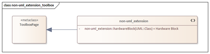 次の例は、上記のステレオタイプ<<hardwareBlock>>を利用するためのツールボックス定義の例です。この定義の際に、元の要素として指定するのは、拡張元のSysML要素ではなく、その元となっているUMLの要素になります。(この例では、UML::Classを括弧内に記述する)
