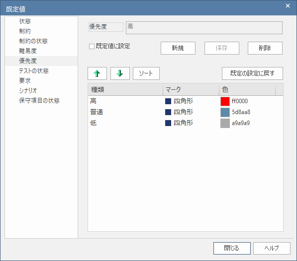 プロジェクト > リファレンス情報 > 既定値 > 既定値 > 優先度 タブ |