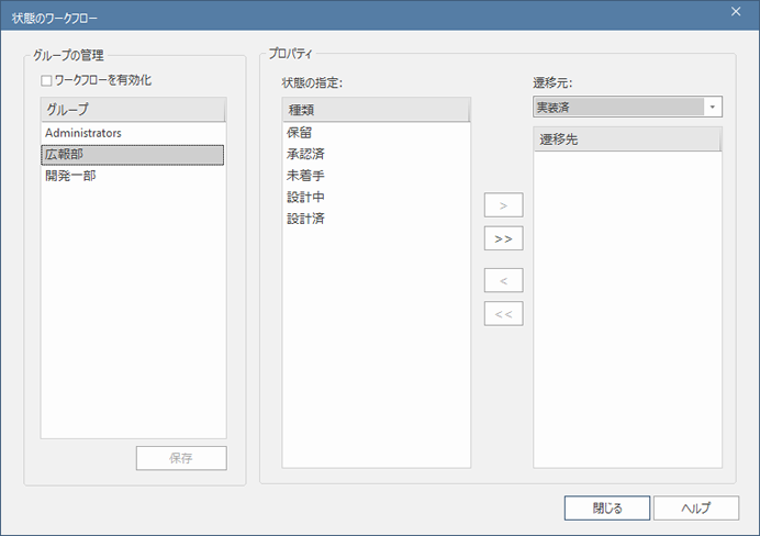 種類の一覧から、遷移元で選択した状態から変更可能な状態を選択します。 すべての状態に遷移可能な場合には、