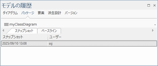 パッケージタブには2つのタブがあります。1つはスナップショット機能を利用するためのタブで、もう1つはベースライン機能を利用するためのタブです。どちらも現在のモデルの情報を保存できますが、スナップショット機能はバージョン17.0で追加された新機能です。ベースライン機能はそれ以前のバージョンから存在する機能です。新規に利用するのであれば、スナップショットタブの機能を利用することをお勧めします。