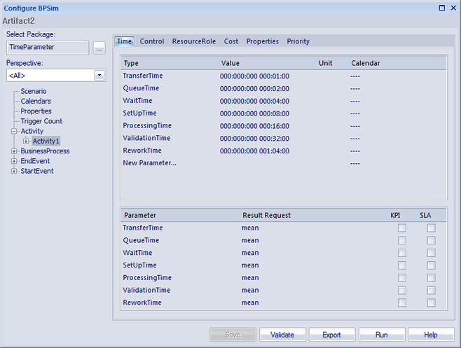 BPSimの設定では、アクティビティに対して時間のパラメータを指定できます。例えばQueue TimeやWait Timeなどが該当します。また、これらの値を結果の要求に含めることもできます。しかし、BPSimのシミュレーションエンジンではこれらの時間の値を単一のProcessing Timeとして扱います。