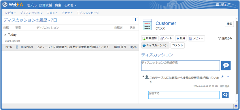 設計支援タブのディスカッションタブでは以下の情報を参照できます。