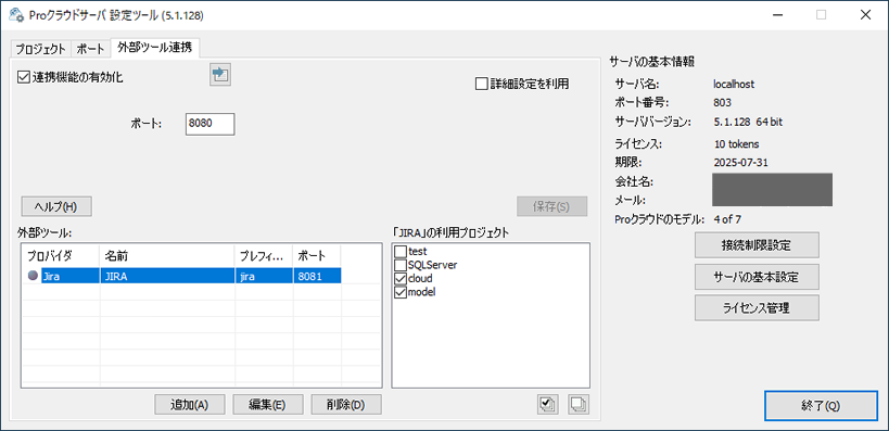- 外部ツール連携タブを開き、「連携機能の有効化」にチェックを入れます。ポートの欄に、Proクラウドサーバの連携サーバが待機するポート番号を設定します。