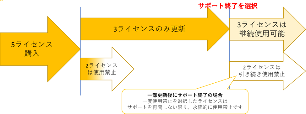 サポート更新をしなかった2ライセンスは使用禁止となり、サポートを再開すると使用可能となります。サポート再開時のサポート期間は、継続使用しているライセンスのサポート期間と一致します。